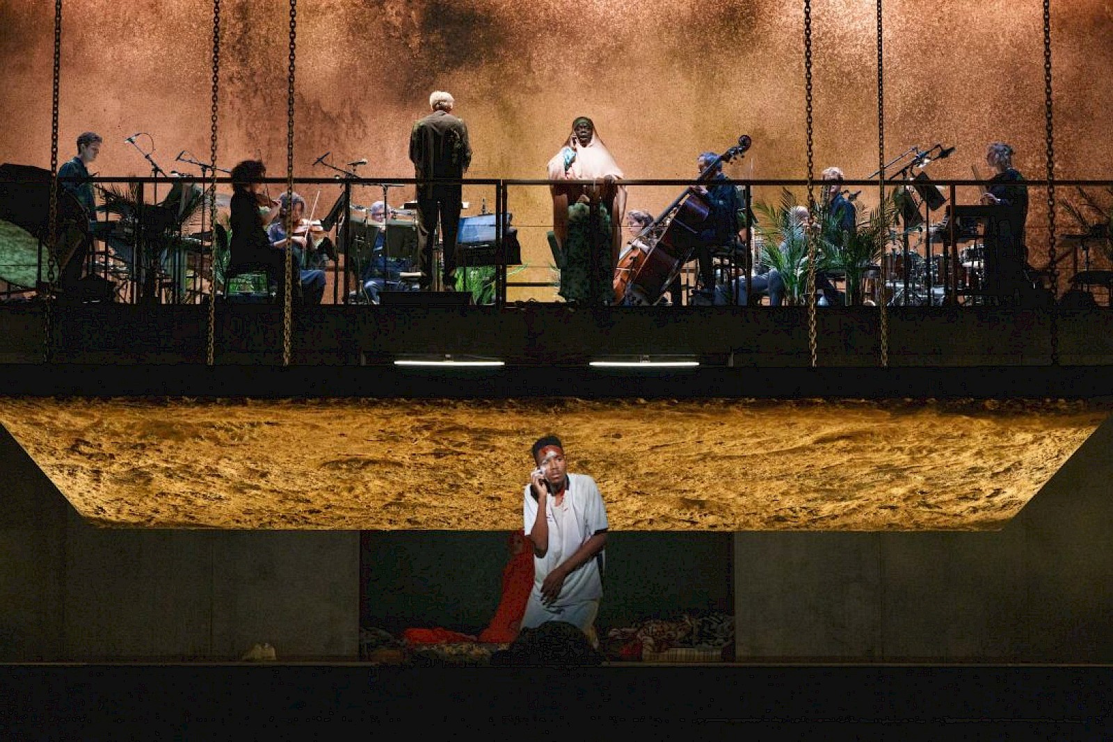 L’orchestre est, pour une fois, au cœur de la scénographie, puisqu’il se situe sur scène, en haut d’une mezzanine. Cet orchestre de chambre ne réunit que treize musiciens dont trois percussionnistes aux outils variés. La musique électronique (ici toujours jouée en direct) a une place prépondérante dans l’orchestration et, fait peu commun à l’opéra, nécessite une sonorisation des instruments et des voix. On s’y fait. La mise en scène est sobre, les décors simples, les costumes crédibles, le tout soutenu par un jeu de lumières et de projections ultraréalistes. Tous ces éléments rendent l’histoire très compréhensible et facile à suivre.