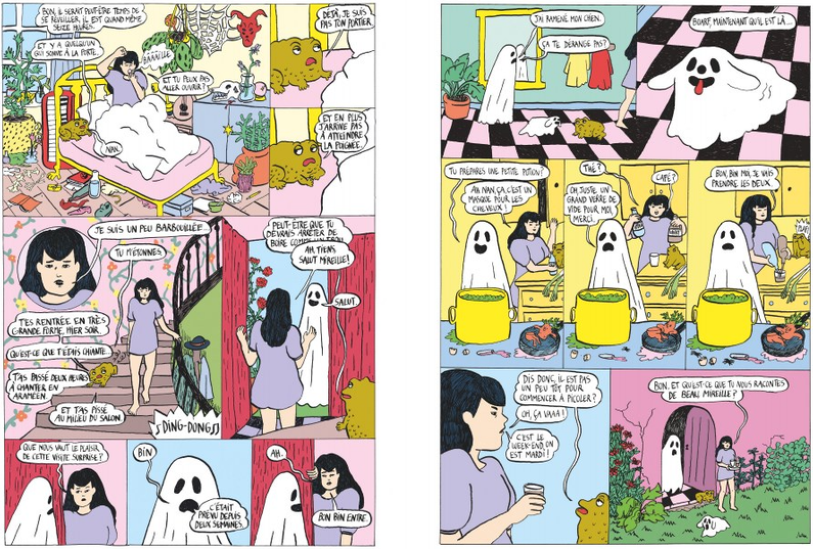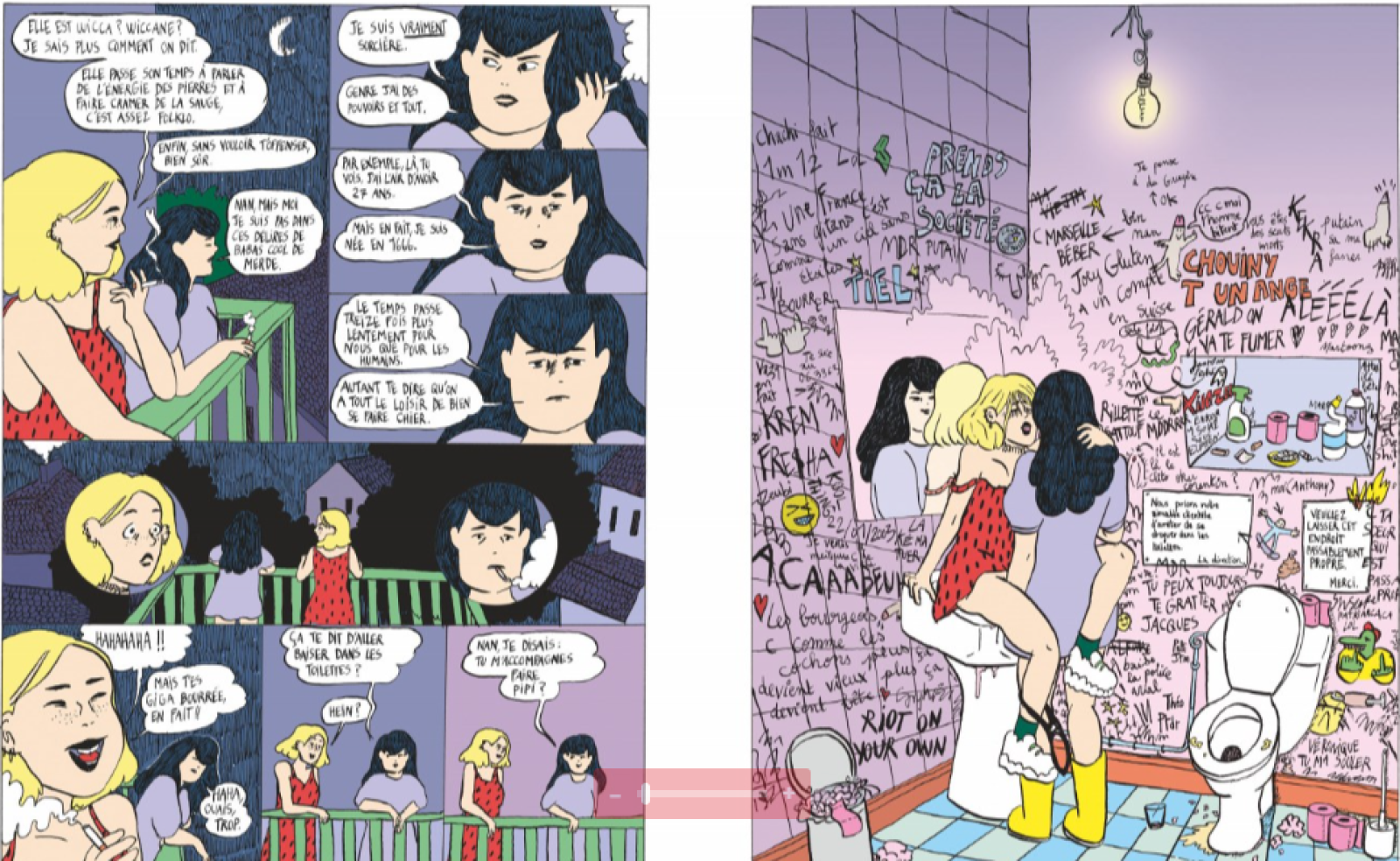 Ancolie, sorcière de « 360 ans mais en apparence 27 ans », incarne une figure de l’anti-héroïne contemporaine : paumée, cynique, mais étrangement magnétique. Elle vagabonde de relations toxiques en instants de flottement seule dans sa chambre, de tavernes en raves. Elle semble traverser une vie d’errance existentielle poussée à l’extrême accompagnée de son crapaud de compagnie, Michel. Cette spirale de désenchantement et d’ennui résonne comme une métaphore adulte d’un malaise plus global, celui d’un monde désenchanté, saturé, et fatigué.