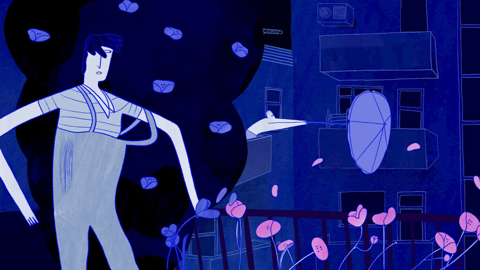 « Dans Balconada, Iva Tokmakchieva fait naitre un monde en suspens, composé d’aplats bleus, roses et blancs. Des balcons en vis-à-vis deviennent le prolongement naturel du domicile. On pense à ces villes du Sud où la vie déborde à l’extérieur des appartements, à mi-chemin entre l’intime et le partagé. Les existences se frôlent sans se mêler : de la lecture, du sport, du linge à étendre. Un quotidien solitaire à proximité des autres, la curiosité aux lisières du privé. Quand le vent se lève, le décor se met en mouvement : la tempête crée une expérience sensorielle, une forme de rêve éveillé. La musique monte, l’écran se couvre de fleurs et de fraises, les lignes éclatent et les gestes se libèrent. Ce qui n’était qu’une juxtaposition de vies devient une expérience commune, chacun·e sur son propre balcon mais traversé·e par la même secousse. Balconada fait basculer la lenteur du quotidien dans une extase douce et collective. » — Magali Bou Assi