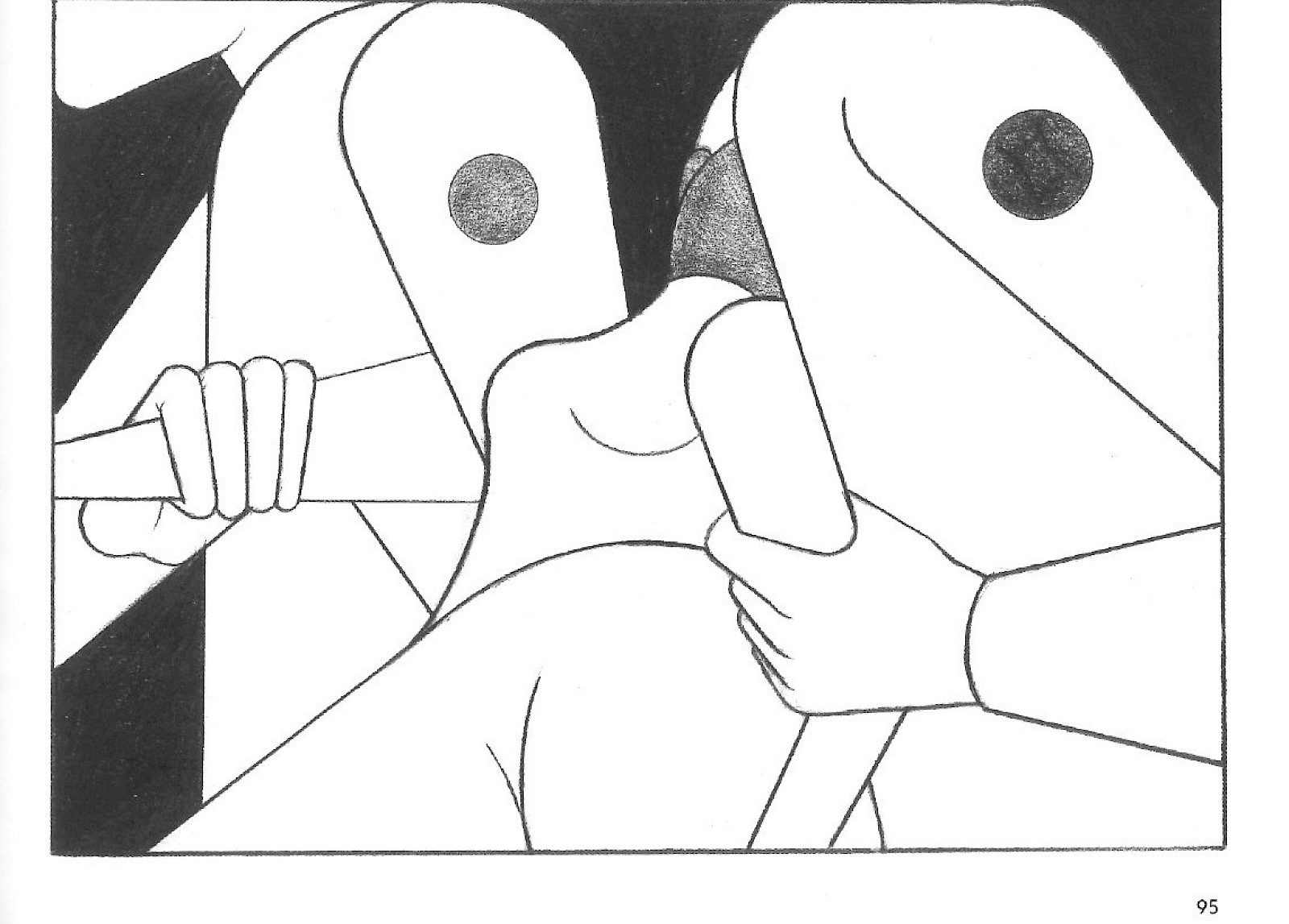 Dans ce nouvel espace, seront dépeintes violence de classe, sexisme et racisme. Et c’est précisément là que le dessin de Fanny Michaëlis révèle toute sa virtuosité. Ses compositions, parfois proches du constructivisme, articulent les interactions et les rapports de force entre les protagonistes avec puissance. La ligne est la force narrative qui structure la lecture : elle semble contraindre les corps, soulignant par ses angles obtus les tensions et les pressions qui pèsent sur eux. Elle montre la brutalité en la schématisant, en la réduisant à un ensemble de traits d’autant plus tranchants.