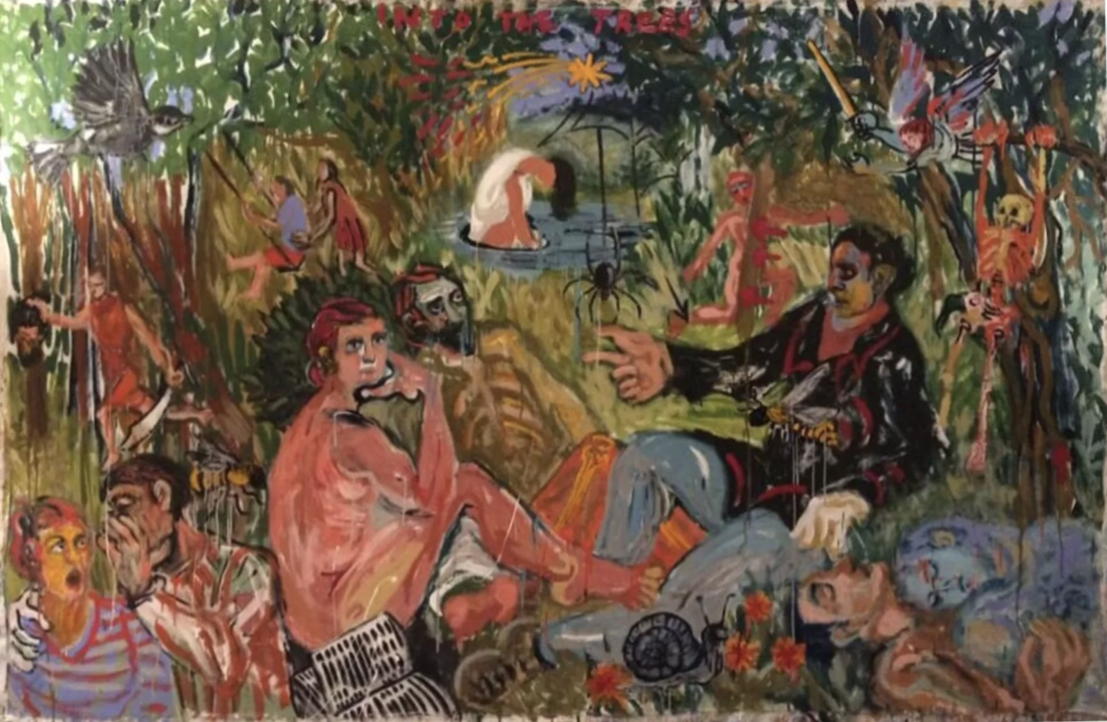 C’est un processus très similaire qui se joue dans la peinture d’Iris Terdjiman. Elle s’immisce, à travers sa facture, ses additions, dans l'œuvre de Manet. Elle démontre aussi sa compréhension de Manet lui-même. Il voulait être un grand maître, elle confirme ce statut. Bien sûr, Terdjiman est très loin d’être la première à faire ça. Le Déjeuner sur l’herbe est une des peintures les plus emblématiques de l’histoire, repeinte des milliers de fois. Mais si Into the Trees (After Manet) n’est pas une œuvre bouleversante par son originalité ou son impact, elle établit une compréhension sincère de sa place, et donc de sa fonction. Ce n’est pas une œuvre qui marque, mais c’est une œuvre qui se déguste. La diversité des motifs qui s’y retrouvent offre un réel plaisir au spectateur. Caché dans les feuillages, à l'arrière-plan, il y a même un homme nu qui court, sabre dans la main gauche, tête humaine dans la main droite. Peut-être Terdjiman cherche-t-elle quand même à tuer pour s’approprier. Je respecte ça.