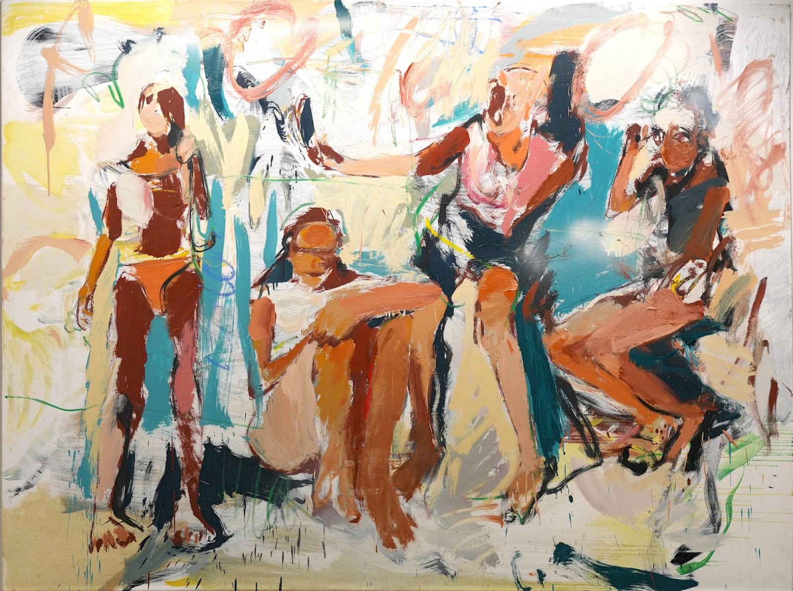 Au début, je suis surprise par mes propres instincts. Devant moi, une peinture qui ressemble à un pastiche du Déjeuner sur l’herbe. Sur le côté droit, il y a même un squelette qui rappelle bien entendu ceux de Basquiat. La référentialité aussi directe, c’est compliqué : avec ce genre de travail, j’ai parfois l’impression d’une étude, comme en musique. Il était très courant pour les peintres, jusqu’à récemment, de copier les œuvres des plus grands. Il y avait un élément d’apprentissage dans ce processus : je comprends en faisant. Mais il y avait aussi un élément de consommation spirituelle, comme les cannibales qui mangent le cœur de leur ennemi pour en tirer une force vitale. C’est une indulgence, mais aussi un fantasme dans le sens lacanien, c'est-à-dire une manière de se construire et de se protéger face à son désir. Et pour beaucoup d’artistes, pas tous, mais certainement pour les artistes de cette exposition, l’objet du désir est la construction de son identité en tant que « Grand Artiste ». Je copie, je consomme, je m’approprie, je tue, pour devenir comme toi. L’exemple le plus évident de ce phénomène est sans doute l’effacement du dessin de Willem de Kooning par Robert Rauschenberg. On est en 1953, et le haut-modernisme règne à New York. Rauschenberg est un jeune artiste, il a déjà réalisé ses White Paintings, mais il n’incarne pas encore l’artiste séminal du passage du modernisme au postmodernisme qu’il deviendra plus tard. De Kooning, lui, a déjà la cinquantaine, et il est établi comme l’un des meilleurs peintres de l'expressionnisme abstrait américain, et donc du monde. Rauschenberg efface donc le dessin de ce grand peintre, qui incarne au fond une certaine figure paternelle. Cet effacement n’est pas une négation : les mouvements de gomme suivent les traces du fusain, c’est une réappropriation, une absorption. Leo Steinberg, grand critique de l’époque, qualifie cet acte d’oedipien. Rauschenberg tue symboliquement son père, et il le tue pour prendre sa place.
