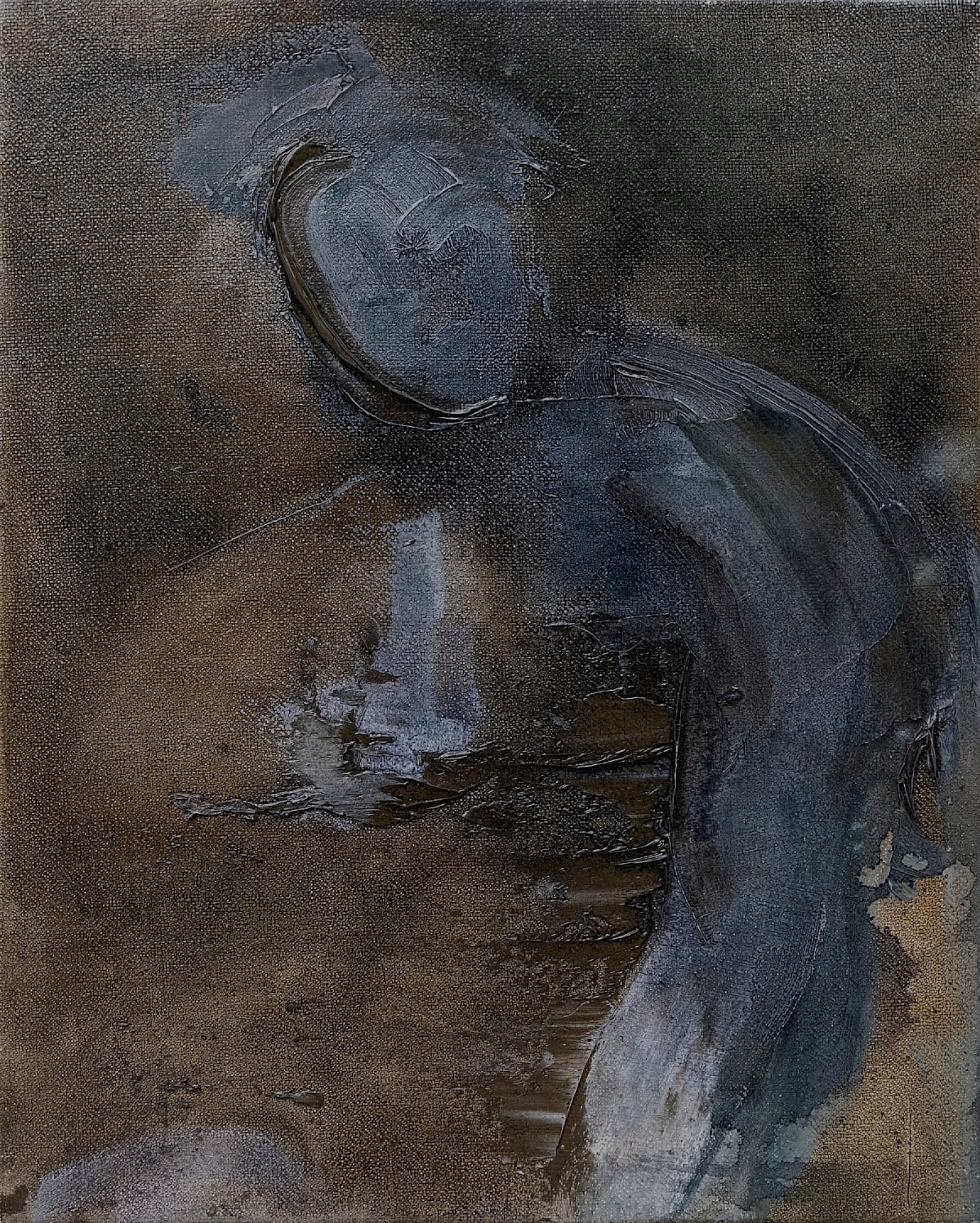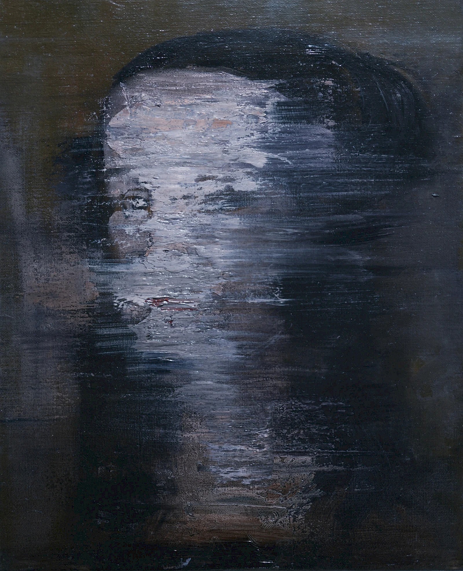 Il y a un troisième artiste représenté dans cette exposition : Alexander Morozov. Nous voilà face à des formats plus petits, à chaque fois des portraits coupés en format buste. D’ailleurs, quand j’ai remarqué l’un d’entre eux, Lost Art-ID 237219. After Cornelius Johnson "Portrait of Amalia Solmes", de l’extérieur de la galerie, j’ai directement pensé aux œuvres tardives de Bacon. De loin, je ne voyais pas l’impasto, juste un flou fantasmagorique qui semblait effacer le visage. De près, le lendemain, je me rends compte que la seule force représentée dans les portraits de Morozov, c’est le passage du temps. Comme chez Terdjiman, les travaux de Morozov sont très situés dans la référentialité à l’histoire de l’art. Il nous propose une série réalisée à partir de peintures emblématiques du XV au XVIIe siècle, notamment deux Rembrandts, complètement différents. Lost Art-ID56745. After Rembrandt van Rijn "Bathsheba in the Bath" est captivant par sa simplicité. Les mouvements de Bathsheba sont réduits à leur essence-même, la composition simplifiée jusqu’à n'être que quelques traits. Mais ces traits suffisent à transmettre la mœlle de l'œuvre. J’y retrouve quelque chose de ma période préférée de Georg Baselitz. Dans les années 1980, Baselitz se peint malade dans son lit dans une série intitulée Mann im Bett. Les traits sont épais et simples, peu de couleurs sont utilisées, mais cette économie de moyens ne fait qu’augmenter l’expressivité du sujet. On va au noyau de ce qu’est la peinture : une composition, un mouvement, une convergence de forces. En opposition, il y a Lost Art-ID 522424. After Rembrandt van Rijn "Self-portrait" qui m’est presque complètement incompréhensible. Je peux y deviner une volonté d’explorer la malléabilité du passage du temps – le Rembrandt de Morozov est bien plus jeune que le « vrai » Rembrandt dans son autoportrait. Malheureusement, je ne trouve pas le rendu assez bon. Il n’y a rien de la sensualité de la toile qui est si typique de Rembrandt, le tout a l’air extrêmement plat. Il n’y a rien de nouveau non plus, aucune exploration supplémentaire comme dans la Bathsheba. C’est aussi l’un des portraits les plus clairs, les plus réalistes de la série. On y voit le mieux un visage.
