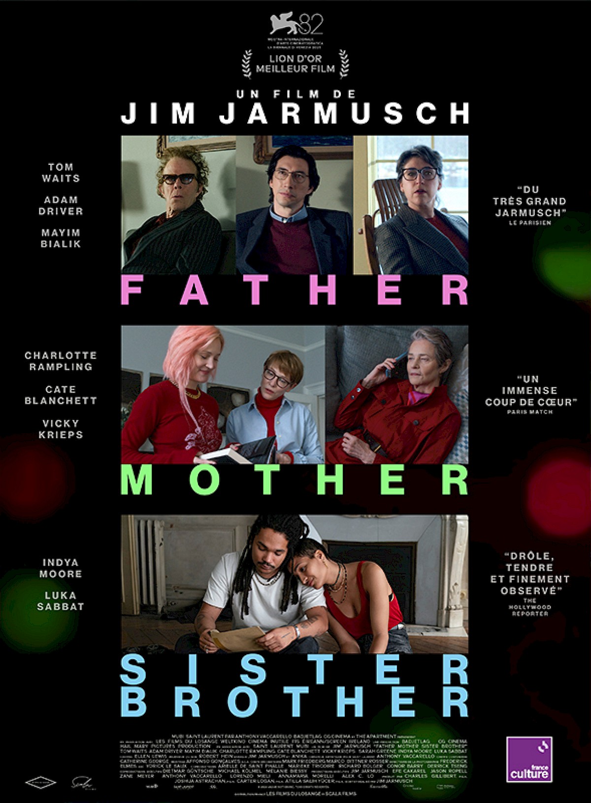 Après la comédie noire sur fond apocalyptique The Dead Don’t Die sortie en 2019, Jim Jarmusch reprend son style de prédilection avec un quatorzième long métrage sous forme de récit en trois segments contemplatifs. Récompensé du Lion d’Or à Venise, Father Mother Sister Brother renvoie, notamment, à Paterson (2016), avec ses silences tacites et son humour pince-sans-rire. On y retrouve d’ailleurs les acteurs habituels du réalisateur, Adam Driver et Cate Blanchett.