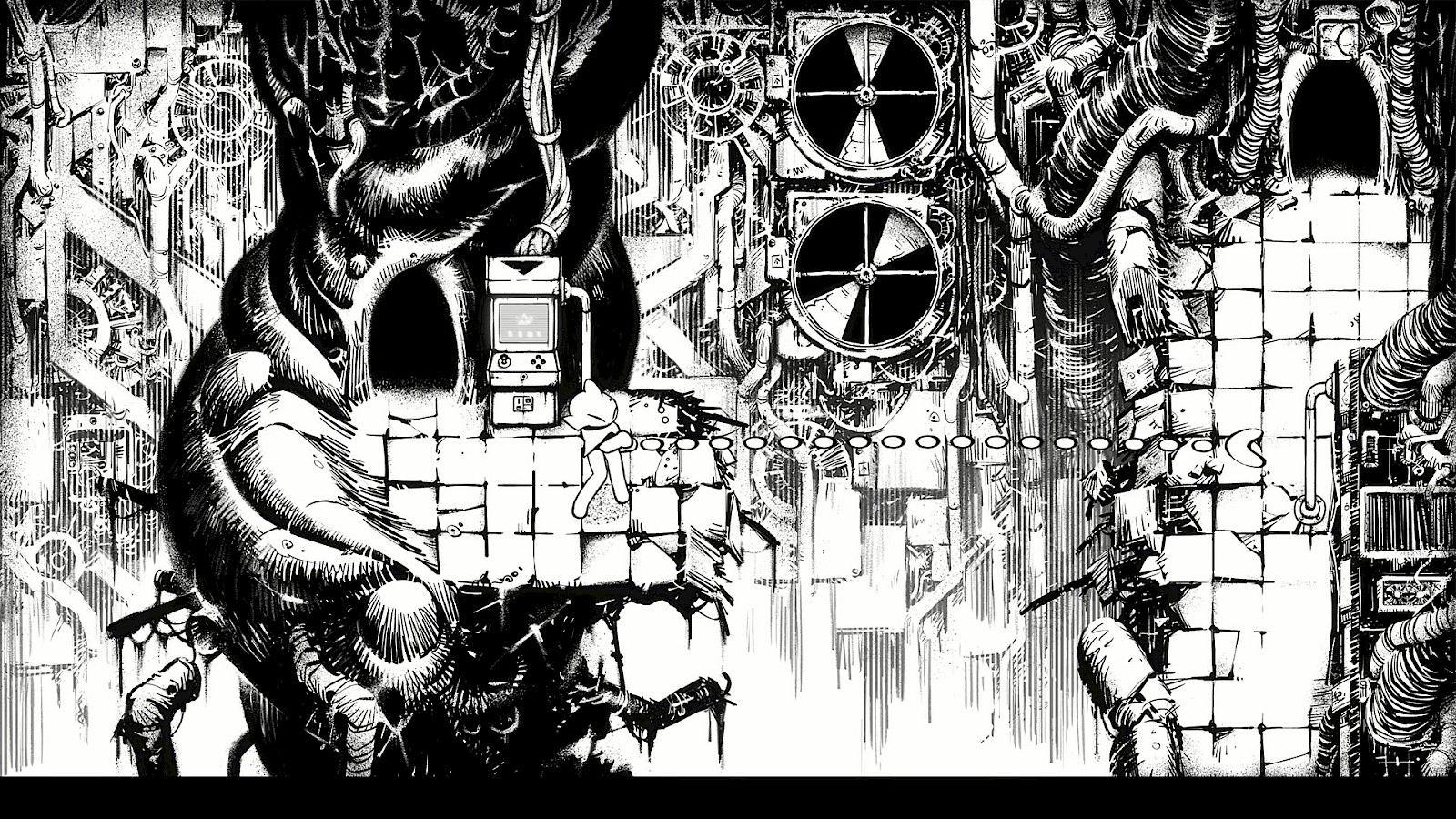C’est l’identité visuelle et esthétique qui m’a directement donné envie de tester la démo de Helix: Descent N Ascent. Ce monde à l’aspect crayonné en noir et blanc offre des images qui ont un air de roman graphique et ça me plait vraiment. J’ai eu l’impression de parcourir les planches d’une œuvre papier, où le monde dessiné possède un côté inquiétant. Des tuyaux semblent vivants et figés à la fois, tandis que les éléments naturels se parent d’épines et de pustules. Les éléments construits, technologiques et organiques se mêlent et se confondent. Au loin, des échos métalliques se font entendre. Les effets sonores appuient l'étrangeté du monde, tout comme la musique aux sons distendus, étirés, qui accompagnent l’errance et donnent envie d’explorer le jeu lentement.