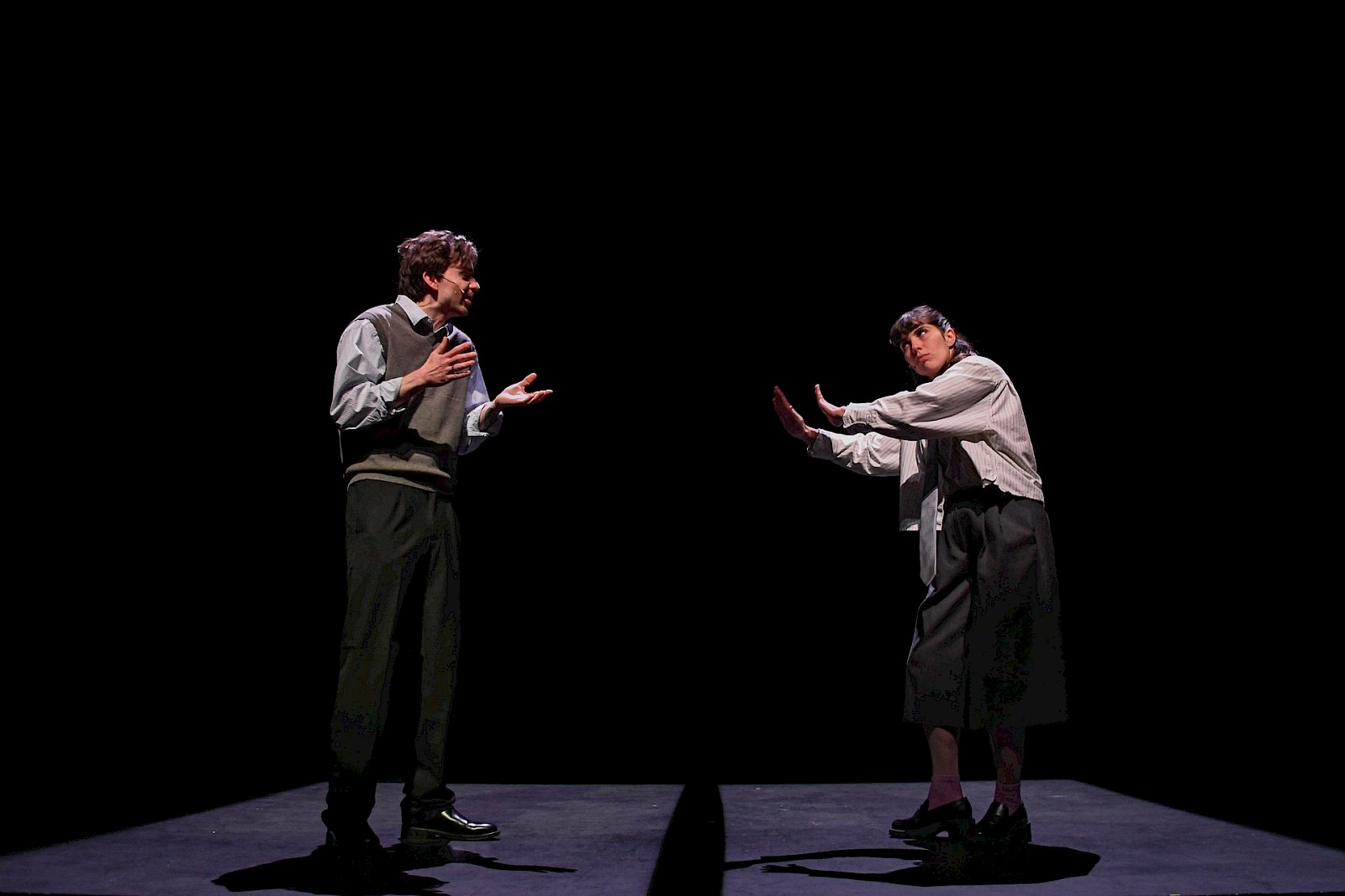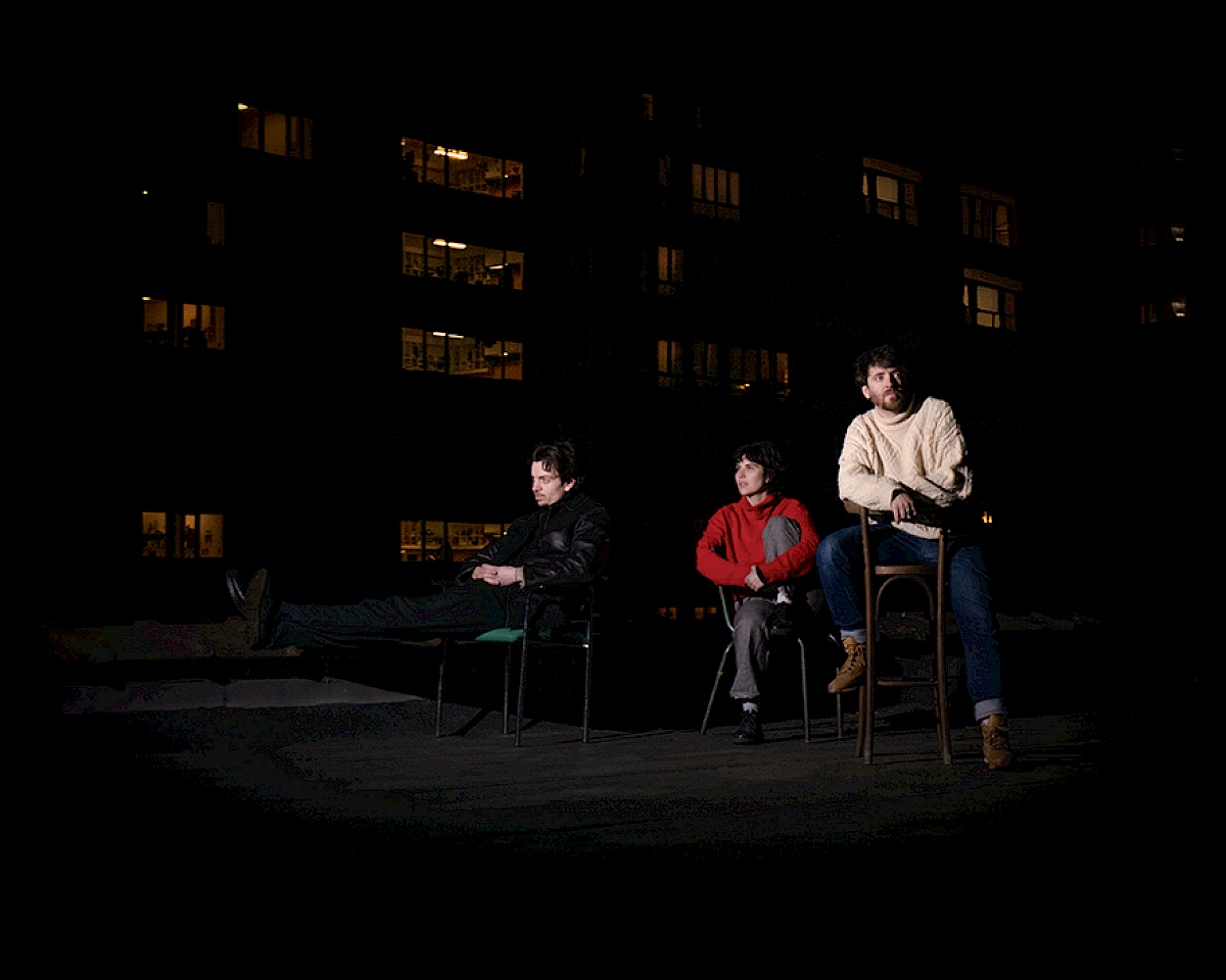 Centrée autour de la relation triangulaire entre les auditeur·ices qui prennent la parole, le présentateur Gonzague Saint-Bris et le public, Ligne ouverte est une pièce qui rend un hommage nostalgique aux émissions de libre antenne, phénomène né dans les années septante qui a donné au commun des mortel·les un espace d’expression, de partage et d’écoute à distance, bien avant l’arrivée des réseaux sociaux. Ce n’est donc pas un hasard si les acteur·ices sont, à l’exception de quelques rares moments, toujours tous·tes les trois sur scène, chacun·e incarnant un·e des protagonistes de cette relation triangulaire. À chaque intervention d’un·e nouvelle·au auditeur·ice, les rôles changent, permettant au public de mieux discerner le passage d’un personnage à un autre. L’excellent jeu d’acteur de Chloé Larrère, Anthony Ruotte et Gabriele Simonini donne à l’ensemble de la pièce une remarquable impression de fluidité, dans une composition où les rôles s’intervertissent sans cesse. Le flux de parole reste toujours fluide et les enchaînements sont parfaitement maîtrisés.