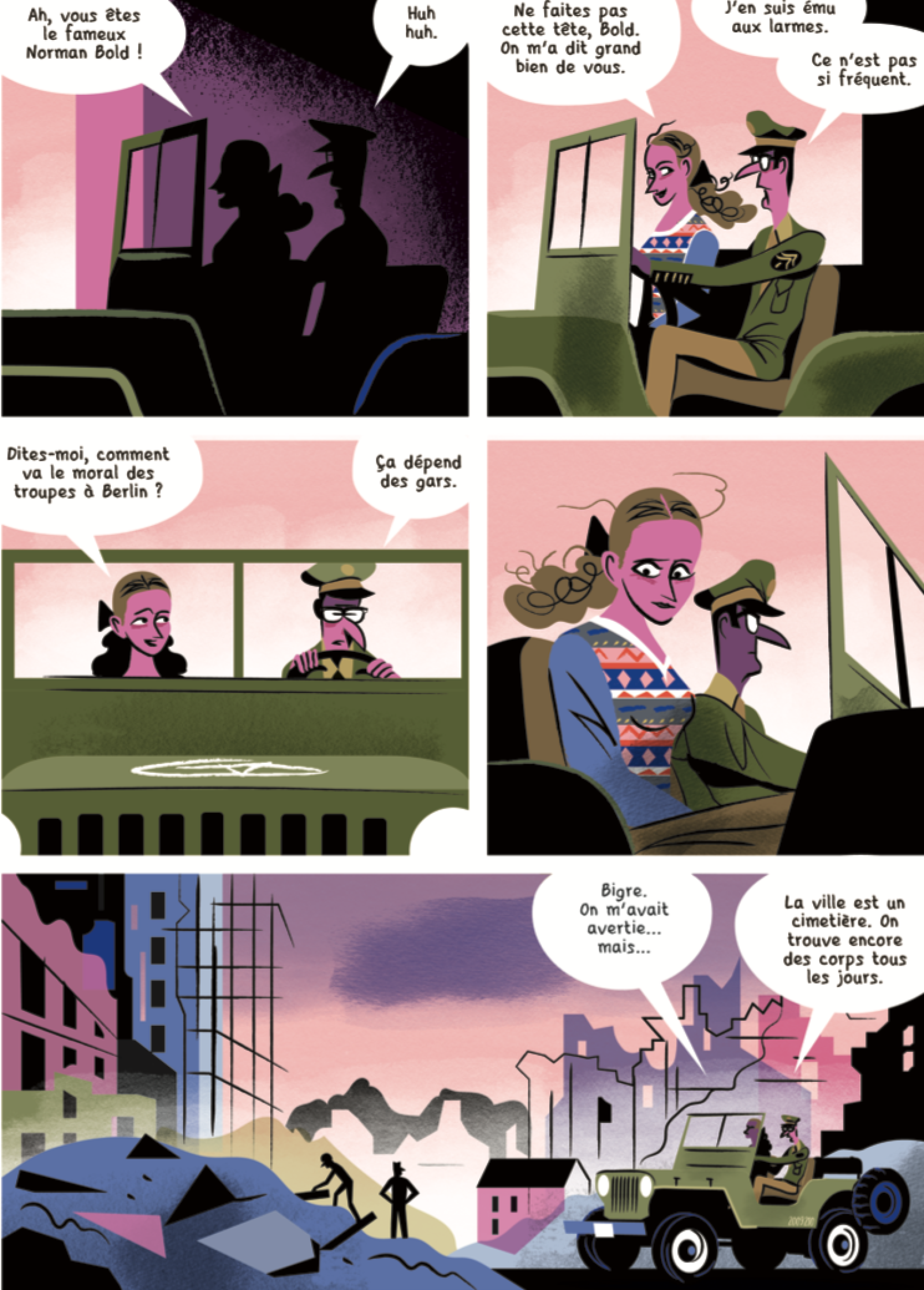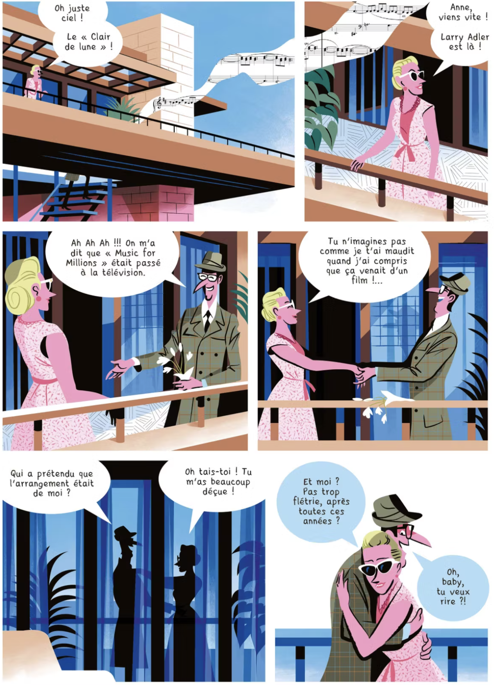 Ce qui frappe en premier dans cette bande dessinée, c’est son identité graphique, avec ses aplats de couleurs qui changent à chaque changement de décor, de la sombre Berlin aux couleurs vibrantes du Mexique en passant par Los Angeles et le parc de Disney World. À chaque partie son décor, sa colorimétrie, des codes graphiques qui varient parfois subtilement, parfois de façon radicale, proposant des moments de rupture ou de suspension dans la narration. Ce jeu sur le graphisme permet ainsi de mettre en avant l’importance de la musique avec des notes d’inspiration cubiste qui prennent soudainement toute la page lors d’une scène de jazz ; ou encore de donner aux époques une identité marquée, en passant par exemple aux accents pop art. Les successions de tableaux ne sont pas sans rappeler des scènes d’un film noir qui se succèdent, exposant tour à tour les différents tiroirs que révèle l’histoire. Tout ce qui semble se profiler au début du récit comme le cœur de l’intrigue ou le mystère à dévoiler (la rivalité pour l’amour de Clarisse, les Werwölfe, le trésor dans le camp soviétique), ne se révèle qu’un élément parmi d’autre dans un récit plus complexe qu’on traverse à toute vitesse, baladé·es de tableau en tableau. Après la première partie berlinoise, qui prend un bon tiers de l’histoire, des scènes bien plus courtes se succèdent, et à peine a-t-on le temps de comprendre ce qui se passe qu’on est déjà baladé·e dans un autre temps (douze ans plus tard, quinze jours plus tard, cinq jours, trois semaines plus tard) et un autre lieu, comme dans un train qui file à toute allure sans nous laisser le temps de profiter du paysage.