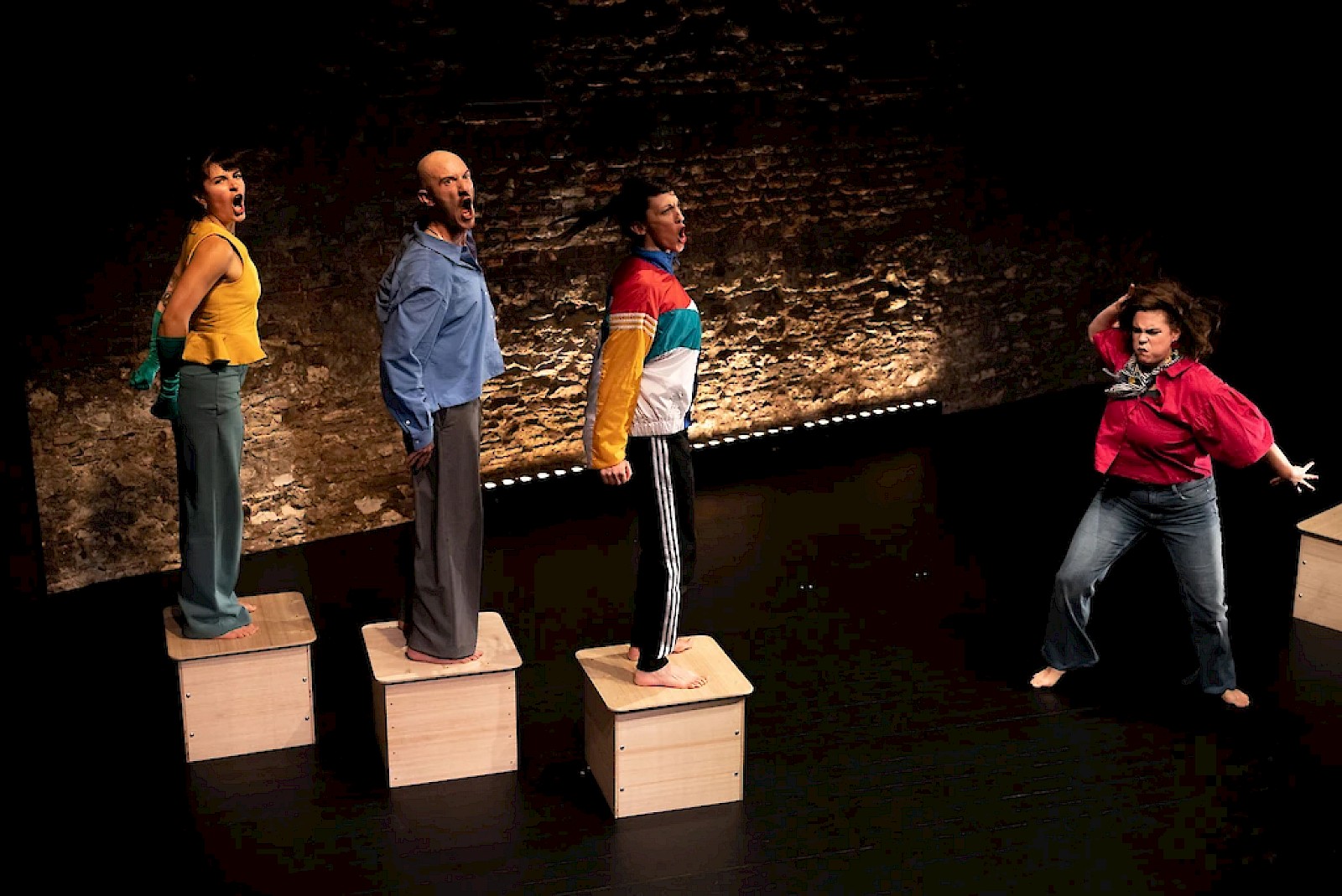Des apports irrécusables du spectacle, on citera sans difficulté ces mêmes chorégraphies. Elles sont évocatrices et envoûtantes, elles parlent d’elles-mêmes. L’énergie bat son plein, les mouvements sont rapides et cinétiques, tout l’espace du plateau est occupé, les accessoires – quatre petits cubes qui font office de tabourets – s’insèrent dans les tableaux : tantôt comme obstacles, tantôt comme promontoires.