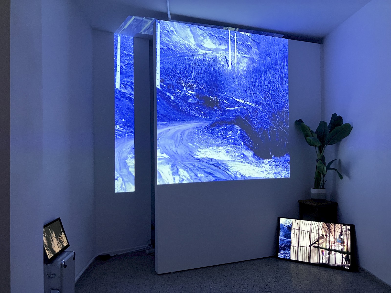 À l’intérieur, des images de mouettes sur fond de ciel bleu sont projetées contre un mur mobile dont l’angle d’ouverture semble inviter le spectateur à entrer dans la vidéo. Une plante, probablement un bananier, cache l’angle droit du mur, et son pot sert de stabilisateur pour un écran posé à ras le sol. On y voit des rushs de campements, de fils barbelés. Un troisième écran posé du côté gauche de la projection, monté sur une valise en guise de socle, fait défiler des images si saturées qu’elles ont l’air abstraites.