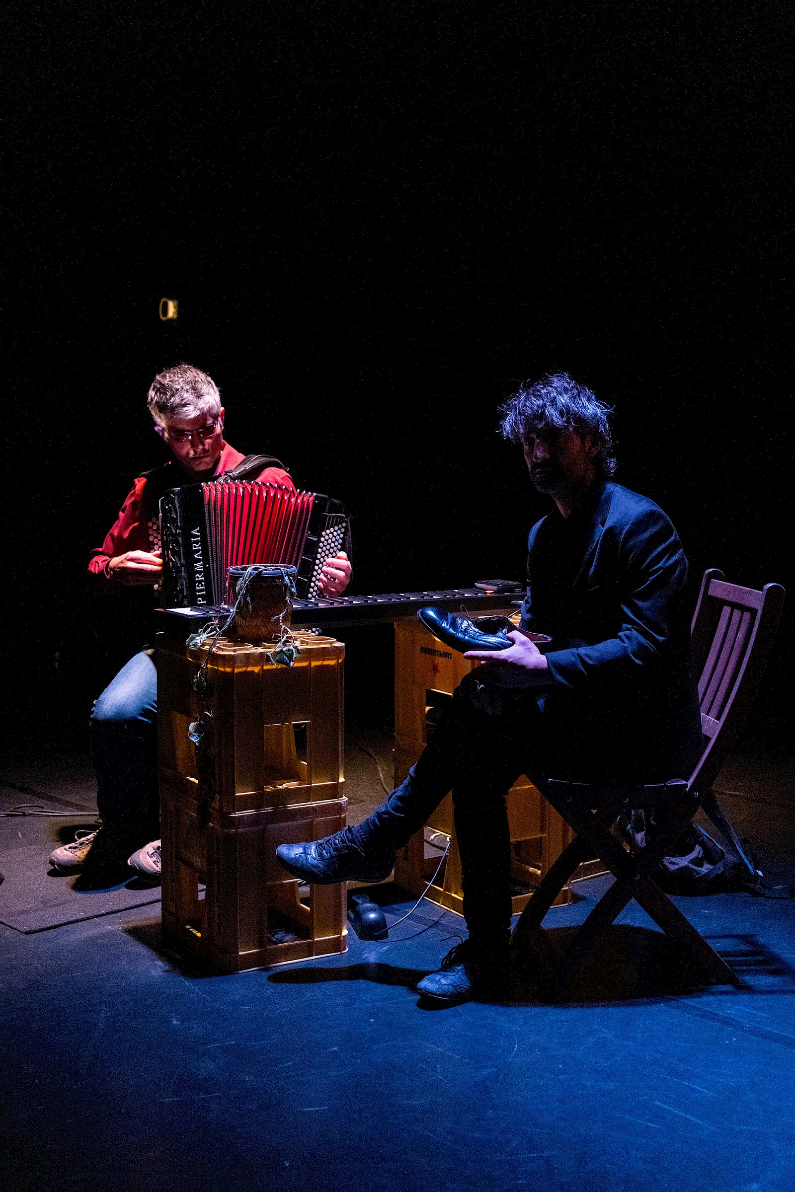 Entrent un comédien et un musicien : David Murgia et Philippe Orivel ; commence le théâtre.
