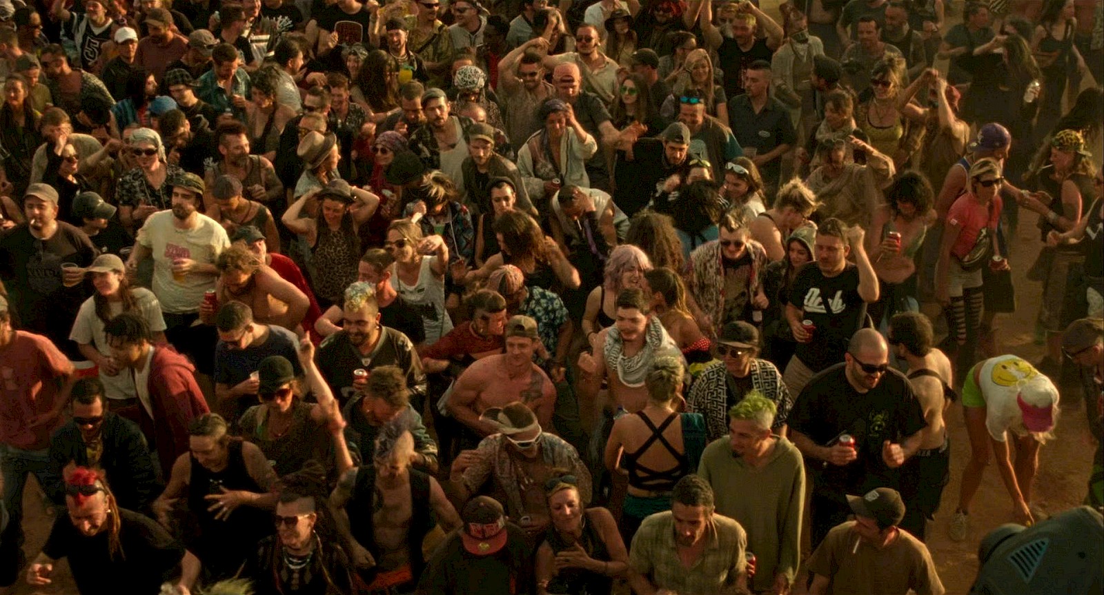 Cette coloration mystique et religieuse coexiste avec la contemporanéité de la culture rave et de ses sonorités. On notera d’ailleurs la capacité du désert, isolé de la société et du système, à accueillir ces mouvements libertaires où se confondent des individus de tous horizons, réunis en un, une foule, dans une effervescence collective. Définie par le sociologue Émile Durkheim, l'effervescence (collective, ou sociale) est un « excitant », une « électricité »2 qui se dégage de moments de rassemblement, où la passion commune exalte encore davantage le sentiment d'unicité, et de rechef l'intensité de la passion. Appliqué dans sa recherche aux communautés religieuses, le concept convient à l'analyse des groupements sociaux et politiques actuels, dans lesquels on retrouve cette amplification de la passion par le sentiment d'interdépendance, et vice-versa. Et la bande son de Sirāt rend particulièrement manifeste le phénomène : ici, c'est la musique qui transporte la foule dans un état de transe, qui ne concerne non plus les individus mais le rassemblement comme un tout. Elle fait également le pont entre la rave party et la salle de cinéma, ralliant le·la spectateur·ice à la cohue.