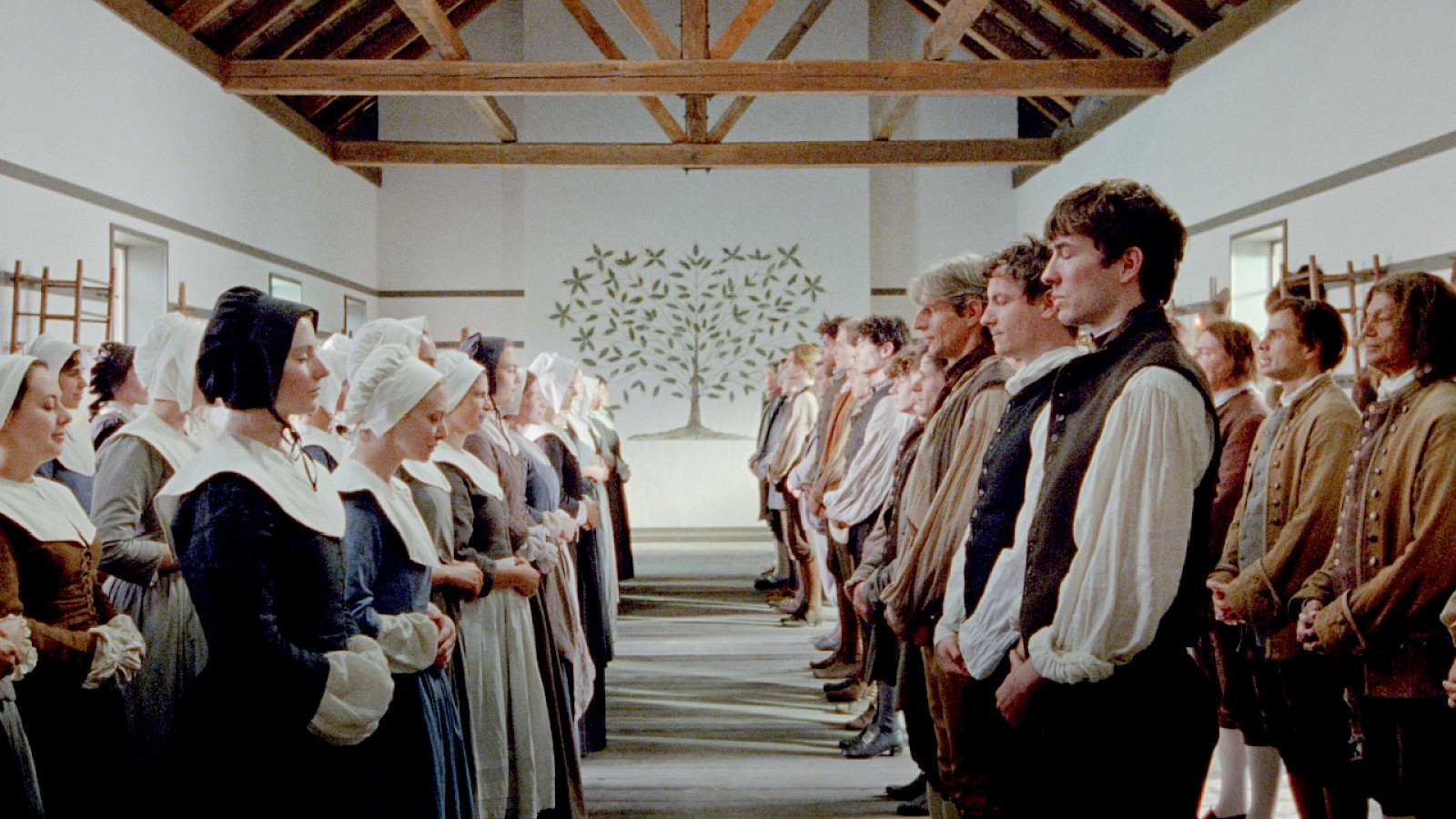 À cette centralité du corps répond un autre élément fondamental de la mise en scène : le travail musical et chorégraphique. Le film est traversé de scènes chantées, portées tantôt par Ann Lee, tantôt par la communauté dans son ensemble, qui ne relèvent jamais du simple ornement. Ces moments ont une véritable fonction structurelle : ils organisent le récit, scandent les états intérieurs, donnent forme à ce qui ne peut se dire autrement. Les chants, souvent collectifs, prolongent les états de transe et inscrivent la foi dans une expérience sensible et partagée. De la même manière, les séquences chorégraphiées ne relèvent pas d’un esthétisme gratuit : elles matérialisent une pensée du mouvement, une manière pour les corps de s’accorder, de résister ou de se soumettre. Chez les Shakers, danser devient un acte spirituel autant que politique. Le geste, répété, codifié, tend vers une forme de dépouillement, mais laisse aussi affleurer une tension constante entre discipline et abandon. En ce sens, musique et mouvement prolongent pleinement le projet du film : ils ne viennent pas illustrer le corps, ils en sont l’expression la plus directe, là où le langage échoue.